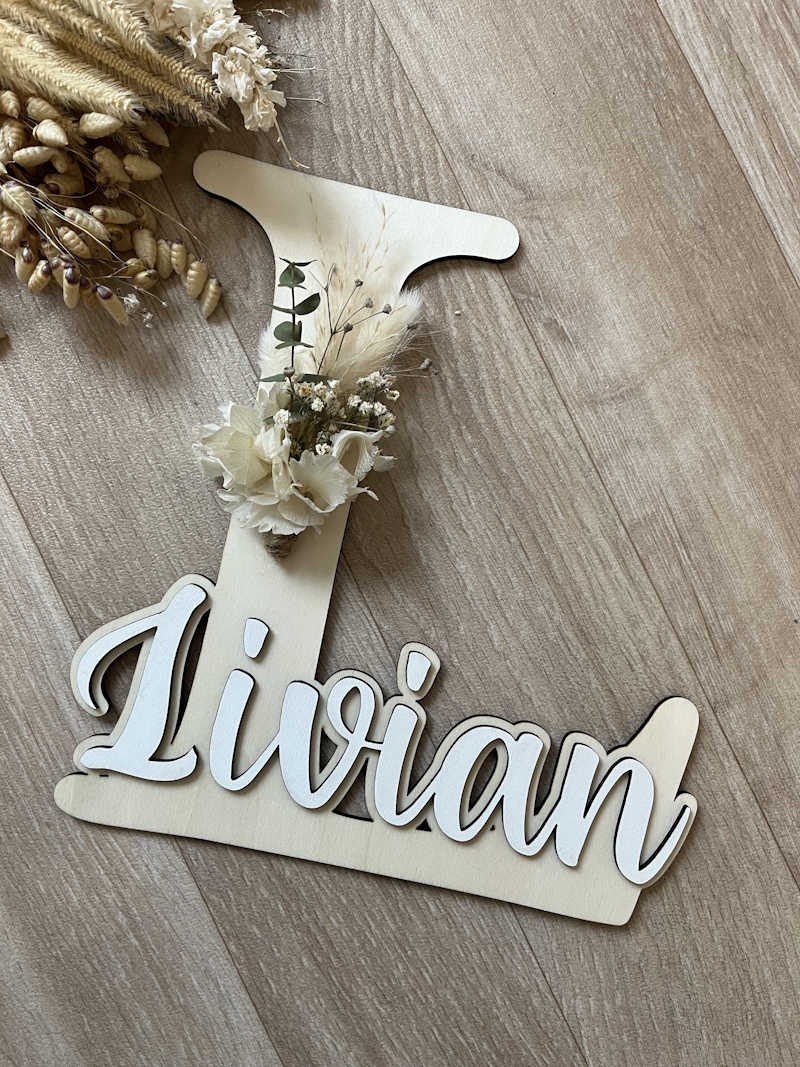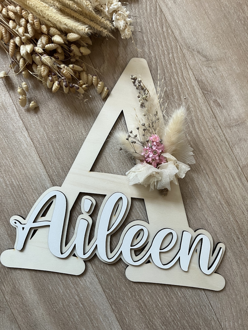 Trockenblumen können sich in der Farbe und in der Zusammenstellung unterscheiden. Sie werden an einem passenden Ort am Buchstaben montiert. Ein Bildaufhänger wird mitgeliefert.