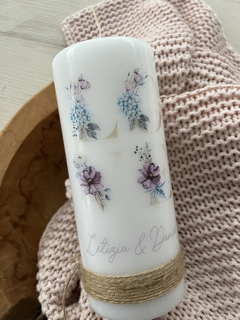 Die Hochzeitskerze hat die Mase 25cm x 8cm. Die Kerze besteht aus einem besonders hochwertigen Wachs, welches langsam und gleichmäßig abbrennt. Zu der Hochzeitskerze erhältst du eine Kerzenbox. Das Sujet wird mit einer hochwertigen Folie auf die Kerze gebracht und im Anschluss versiegelt.
